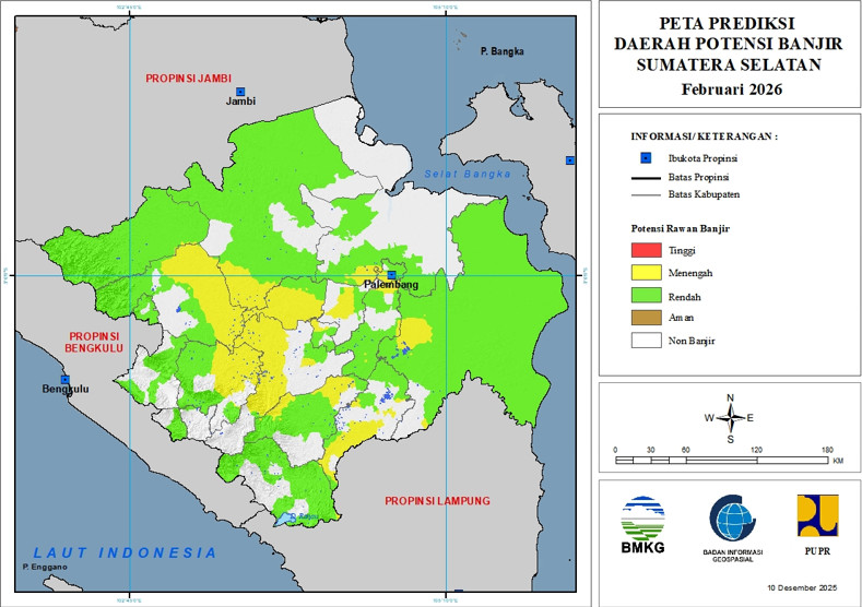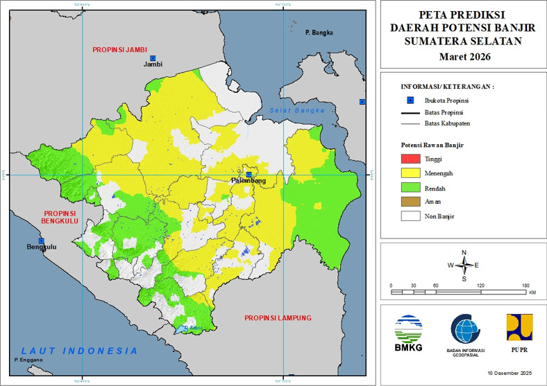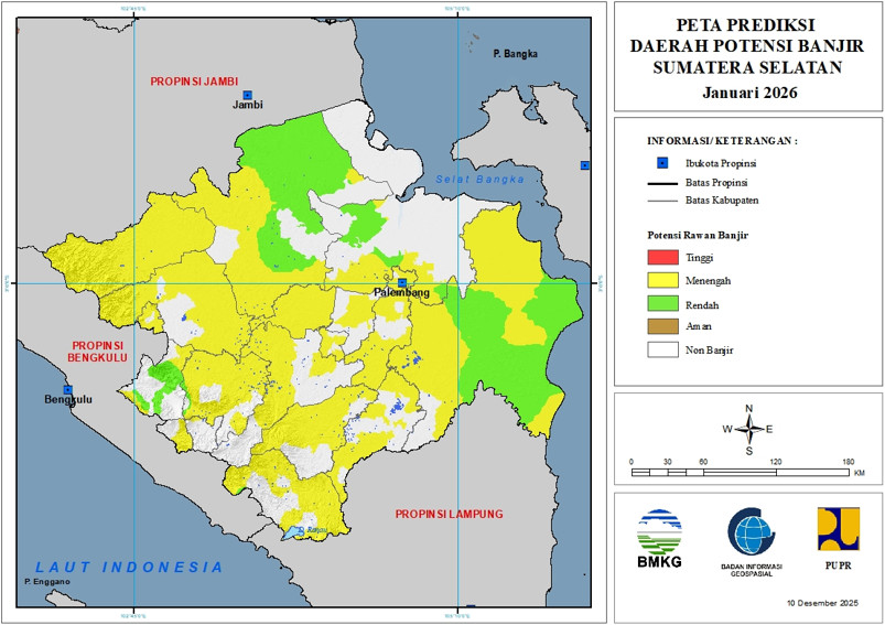 Prediksi Daerah Potensi Banjir Provinsi Sumatera Selatan Periode Januari – Maret 2026 (Update 10 Desember 2025)