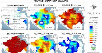 Sebagian besar wilayah Sumatera Selatan diprediksi mendapatkan curah hujan dengan kategori Menengah (100 – 300 mm), kecuali sebagian kecil wilayah Muara Enim bagian selatan diprediksi mendapatkan curah hujan dengan kategori Tinggi (>300 mm).
