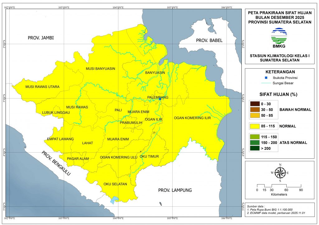 Seluruh wilayah Sumatera Selatan diprediksi mengalami sifat hujan Normal pada bulan Desember 2025.