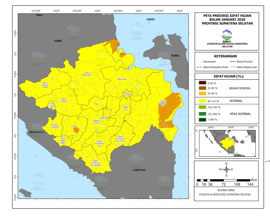Pada Januari 2026, sebagian wilayah Sumatera Selatan diprediksi mendapatkan curah hujan dengan kategori Menengah (151–300 mm). Sementara wilayah lainnya meliputi sebagian besar Musi Rawas, Lahat, PALI, Muara Enim, Prabumulih, OKI Timur, sebagian kecil wilayah OKI, OKU dan OKU Selatan diprediksi akan mendapatkan curah hujan dengan kategori Tinggi (301-400 mm).