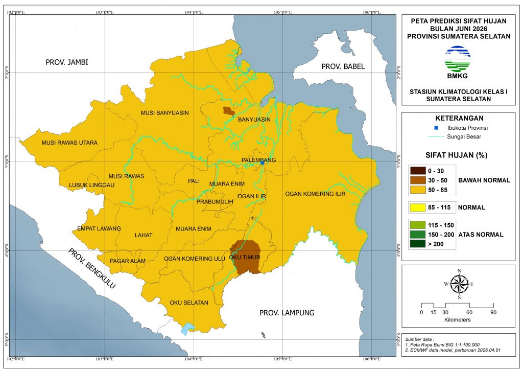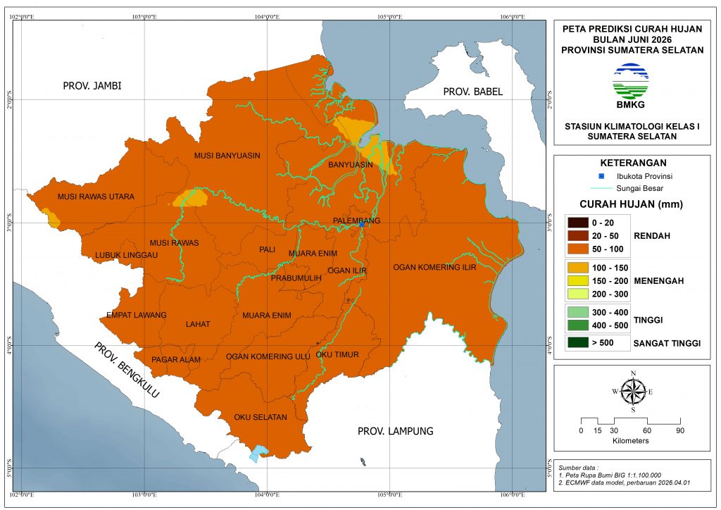 Sebagian besar wilayah Sumatera Selatan diprediksi mendapatkan curah hujan dengan kategori Rendah (50–100 mm) pada Juni 2026, kecuali wilayah Banyuasin bagian timur, sebagian kecil Musi Banyuasin bagian barat, sebagian kecil Musi Rawas bagian utara, dan sebagian kecil Musi Rawas Utara bagian barat diprediksi mendapatkan curah hujan kategori Menengah (101–150 mm).