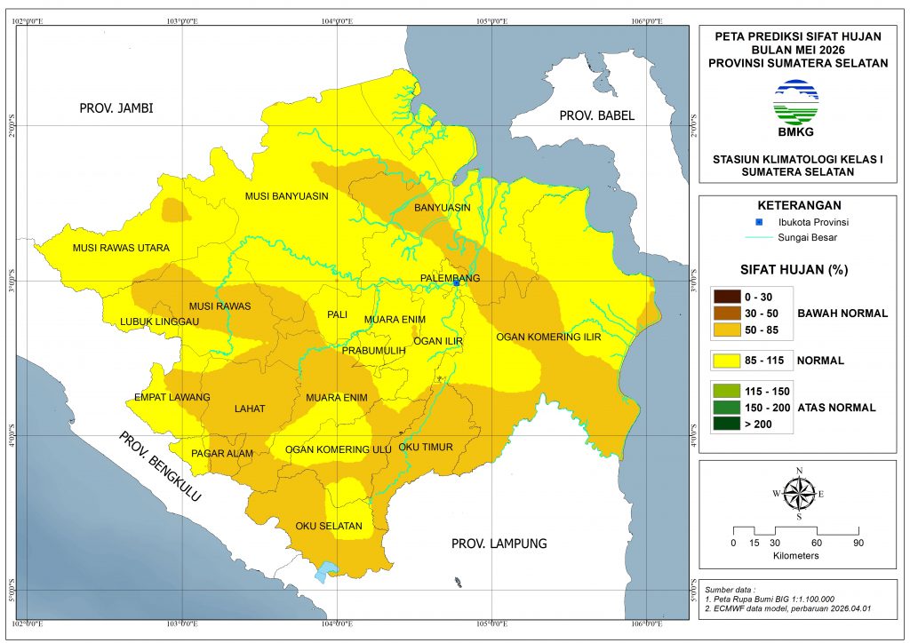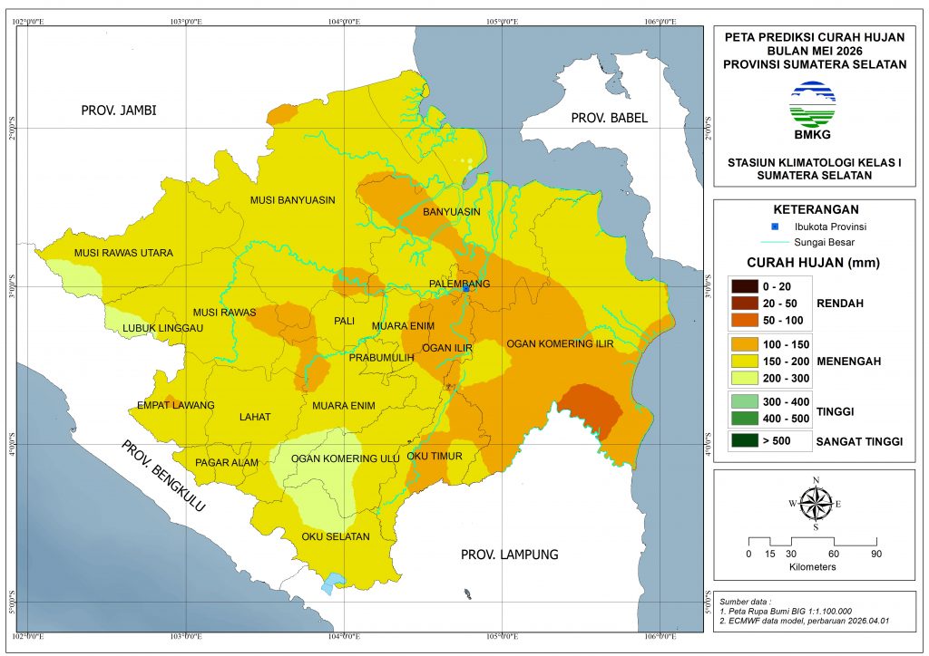 Pada Mei 2026, hampir seluruh wilayah Sumatera Selatan diprediksi mendapatkan curah hujan dengan kategori Menengah (101–300 mm), kecuali sebagian kecil OKI bagian timur diprediksi mendapatkan curah hujan dengan kategori Rendah (50–100 mm).