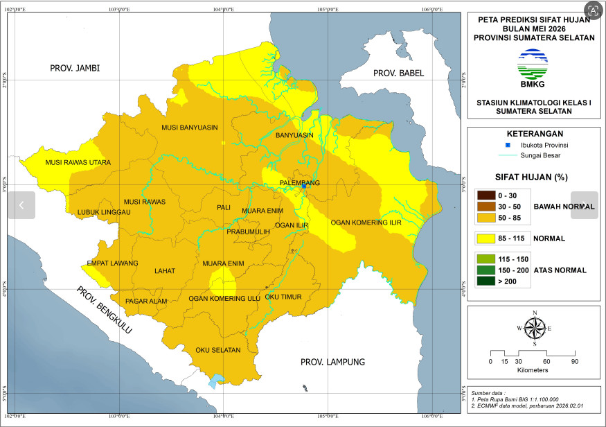 Sebagian besar wilayah Sumatera Selatan diprediksi mengalami sifat hujan Bawah Normal.Sementara itu, sebagian kecil wilayah Banyuasin, sebagian kecil wilayah Musi Rawas utara, sebagian kecil wilayah Empat Lawang,sebagian kecil wilayah OKI serta sebagian besar wilayah Ogan Ilir diprediksi sifat hujan Normal.
