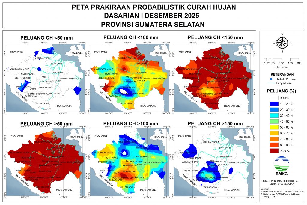 Peluang lebih dari 80% terjadi CH Menengah (51-150 mm): sebagian besar wilayah Sumatera Selatan.