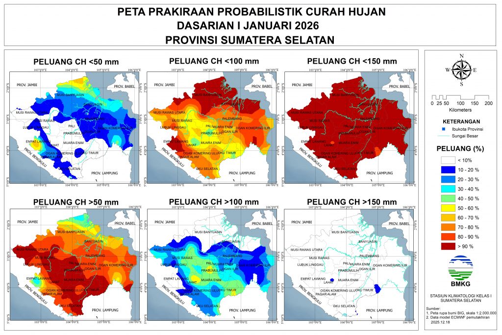 Peluang lebih dari 80% terjadi CH Menengah (51-150 mm): sebagian besar wilayah Sumatera Selatan.