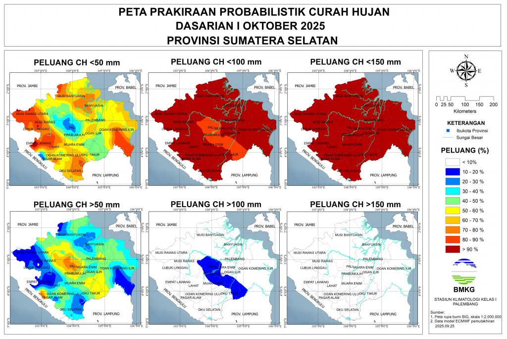 Peluang lebih dari 50% terjadi CH Rendah (0-50 mm): Sebagian besar wilayah Sumatera Selatan.