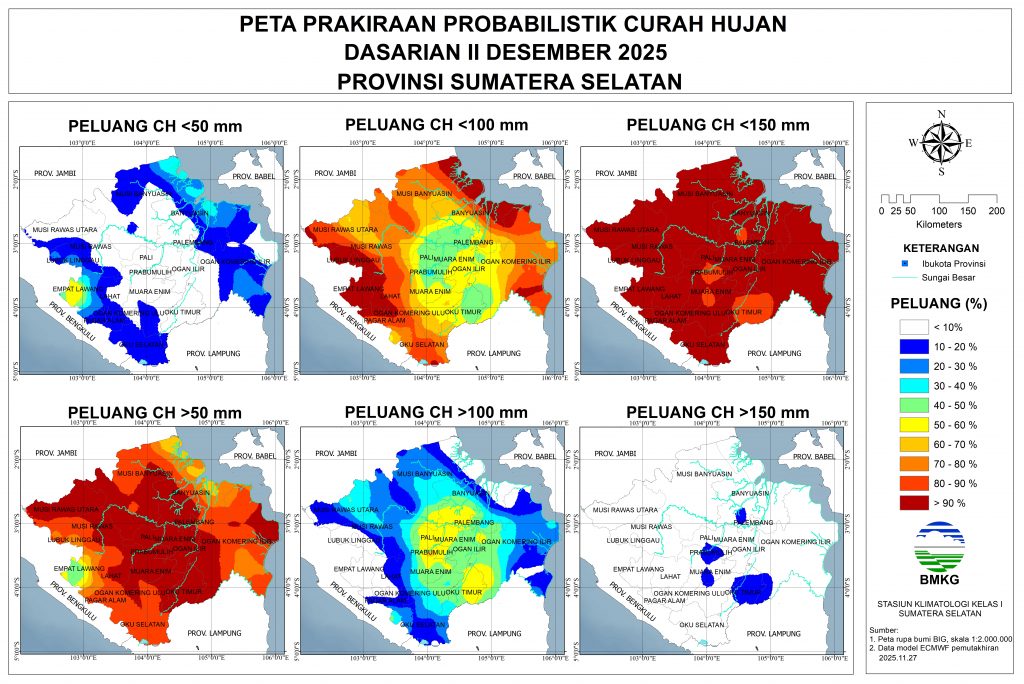 Peluang lebih dari 80% terjadi CH Menengah (51-150 mm): sebagian besar wilayah Sumatera Selatan.