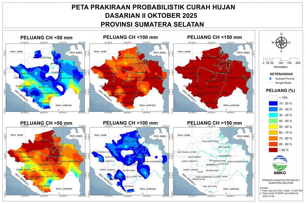 Prediksi Probabilistik Curah Hujan Dasarian II Oktober 2025 (update 10 Oktober 2025)