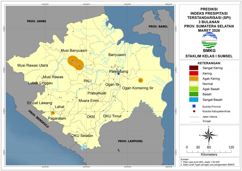 PDIE Prakiraan Prakiraan Tingkat Kekeringan Prediksi Tingkat Kekeringan Bulan Maret 2026 23 Februari 2026 siska masrury prakiraan tingkat kekeringan Pada bulan Maret 2026, tingkat kekeringan di sebagian besar wilayah Sumatera Selatan diprediksi mengalami kondisi Normal kecuali di sebagian kecil Musi Banyuasin, PALI , Pagaralam dan sebagian kecil OKI yang mengalami kondisi Agak Kering.