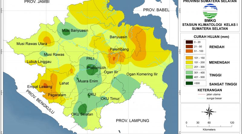 Pada bulan Februari 2026, distribusi curah hujan di sebagian besar wilayah Sumatera Selatan berada pada kategori Menengah (101–300 mm). Curah