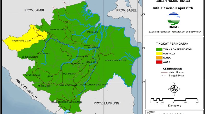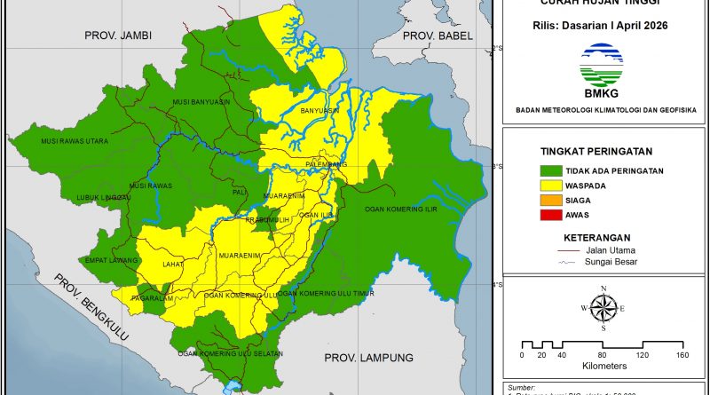 Gambar 1. Peta PDCHT Provinsi Sumatera Selatan Tabel Status Peringatan Dini Curah Hujan Tinggi Provinsi Waspada (150–200 mm/dasarian) Siaga (200–300